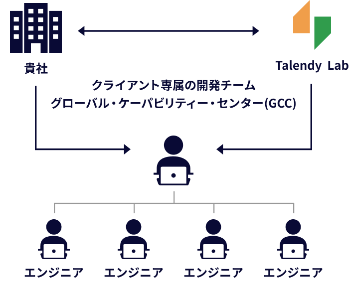 お客様が必要とするスキルや経験を持つエンジニアチームを社外に体制構築しワンチームとして開発します。